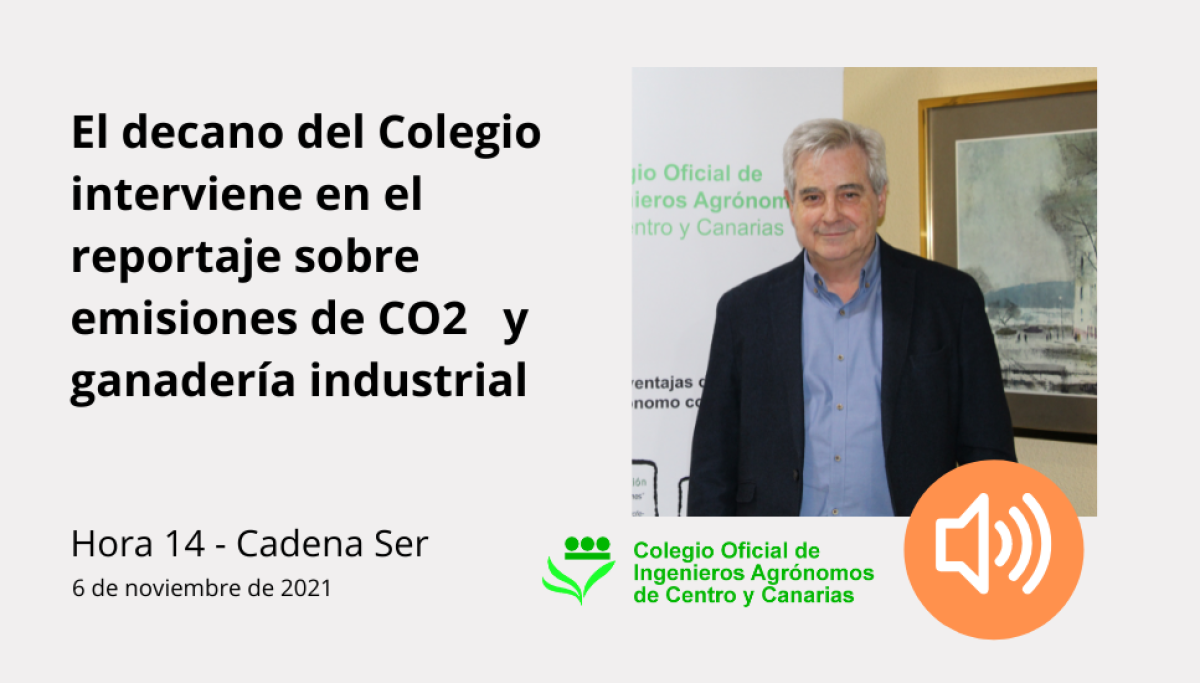 El decano del Colegio, Francisco González, ha intervenido el pasado fin de semana en el informativo Hora 14 de la Cadena Ser, en el reportaje sobre emisiones de CO2 y granjas industriales, en el marco de la cobertura que la cadena está realizando con motivo de la Cumbre del Clima que se celebra estos días en Glasgow.