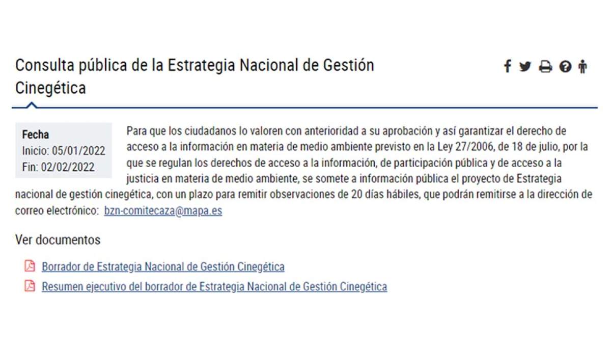 Toda la información de la consulta pública en la web del Ministerio: https://www.mapa.gob.es/es/ganaderia/participacion-publica/consulta_estrategia_caza.aspx
